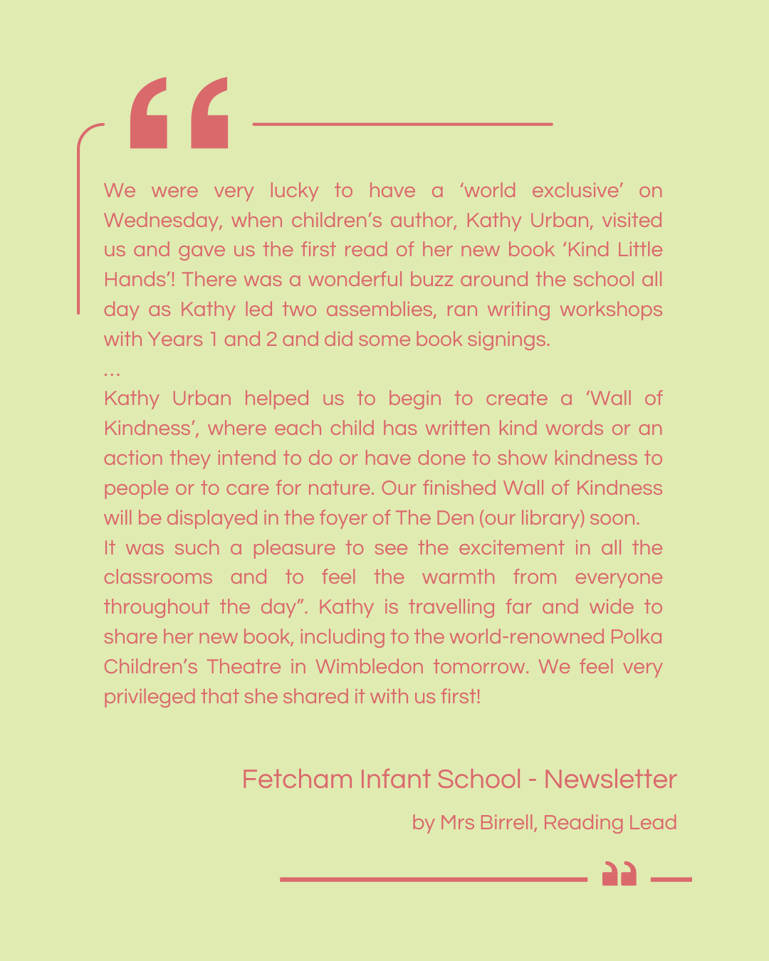 ‘From the moment I contacted Kathy to arrange an Author visit for our Early Years classes, it was a very straight forward and relaxed process. She was very accommodating and flexible from the get-go. The children loved the interactive nature of Kathy’s well-planned readings and were mesmerised by her exciting and colourful stories. She had a fantastic, child friendly approach which the students responded really well to.